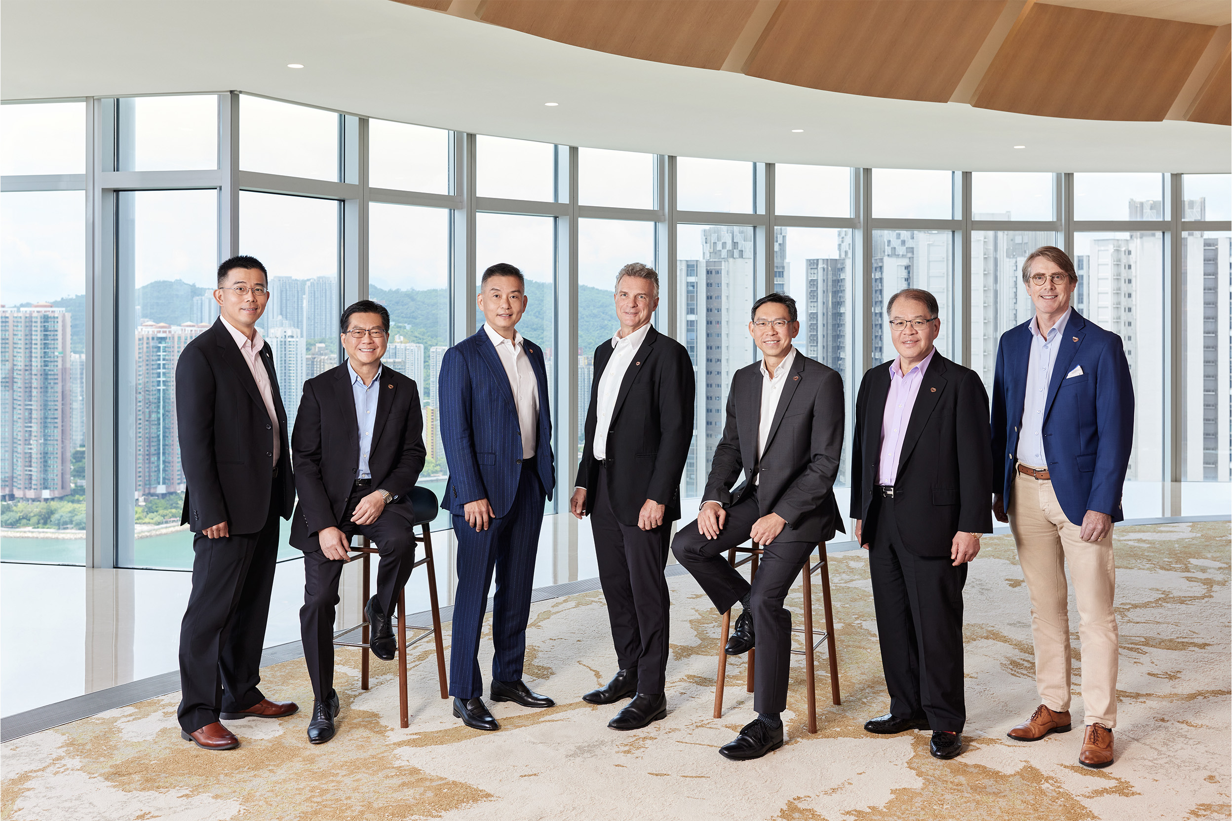 The Board of Directors includes Peter Brien, Chairman & Independent Non-Executive Director (fourth from left); Andy Cheung, Executive Director and Chief Executive Officer (third from left); Wong Hung Han, Executive Director and Chief Operating Officer (third from right); Ricky Tsang, Executive Director and Chief Financial Officer (second from left); Alvin Wong, Non-Executive Director (second from right); Victor Jong, Non-Executive Director (first from left); and Ted Osborn, Non-Executive Director (first from right).