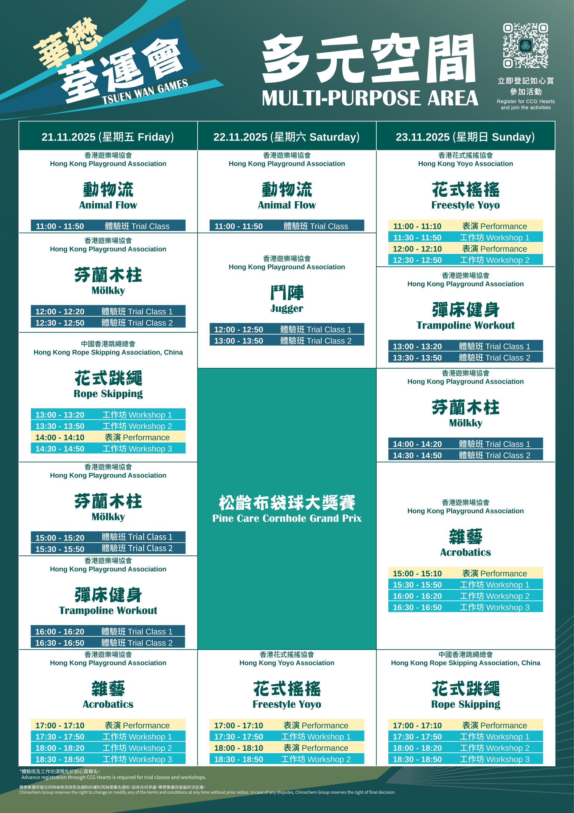 The "Get Ready" phase features over 70 activities across six themed categories designed to help participants build fitness and skills ahead of the main competitions. This phase focuses on family participation, inviting everyone to train together and embrace their role as "athletes" of the CCG Tsuen Wan Games. Participants can experience everything from traditional games to emerging sports, feeling how the CCG Tsuen Wan Games goes beyond a traditional sports meet by emphasising holistic wellbeing that balances body and mind.